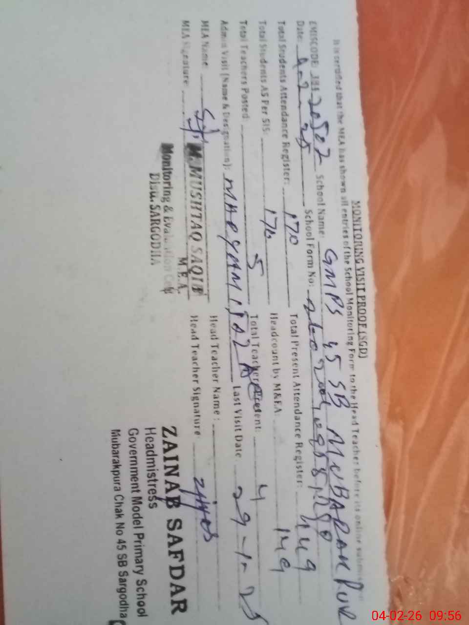 | EMIS Code: 38420502 | Name of School: GMPS CHAK NO.45 SB MUBARAK PURA | |||