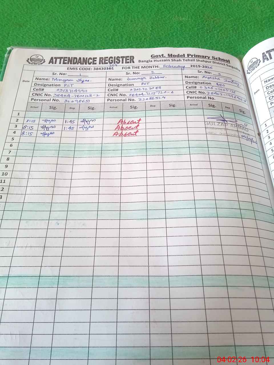 | CNIC | Full Name | Designation | R/C | Absence During Last Calender Month |