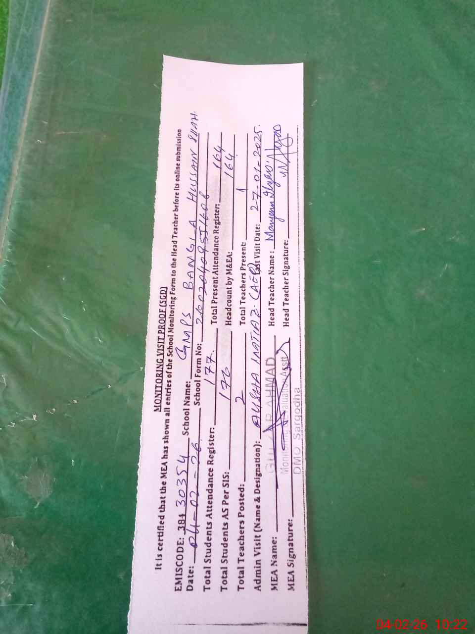 | Attendance Register | Head Teacher | MEA with School | Visit Proof |