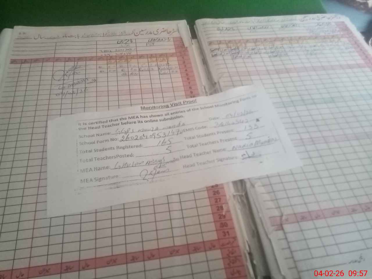 | Attendance Register | Head Teacher | MEA with School | Visit Proof |
