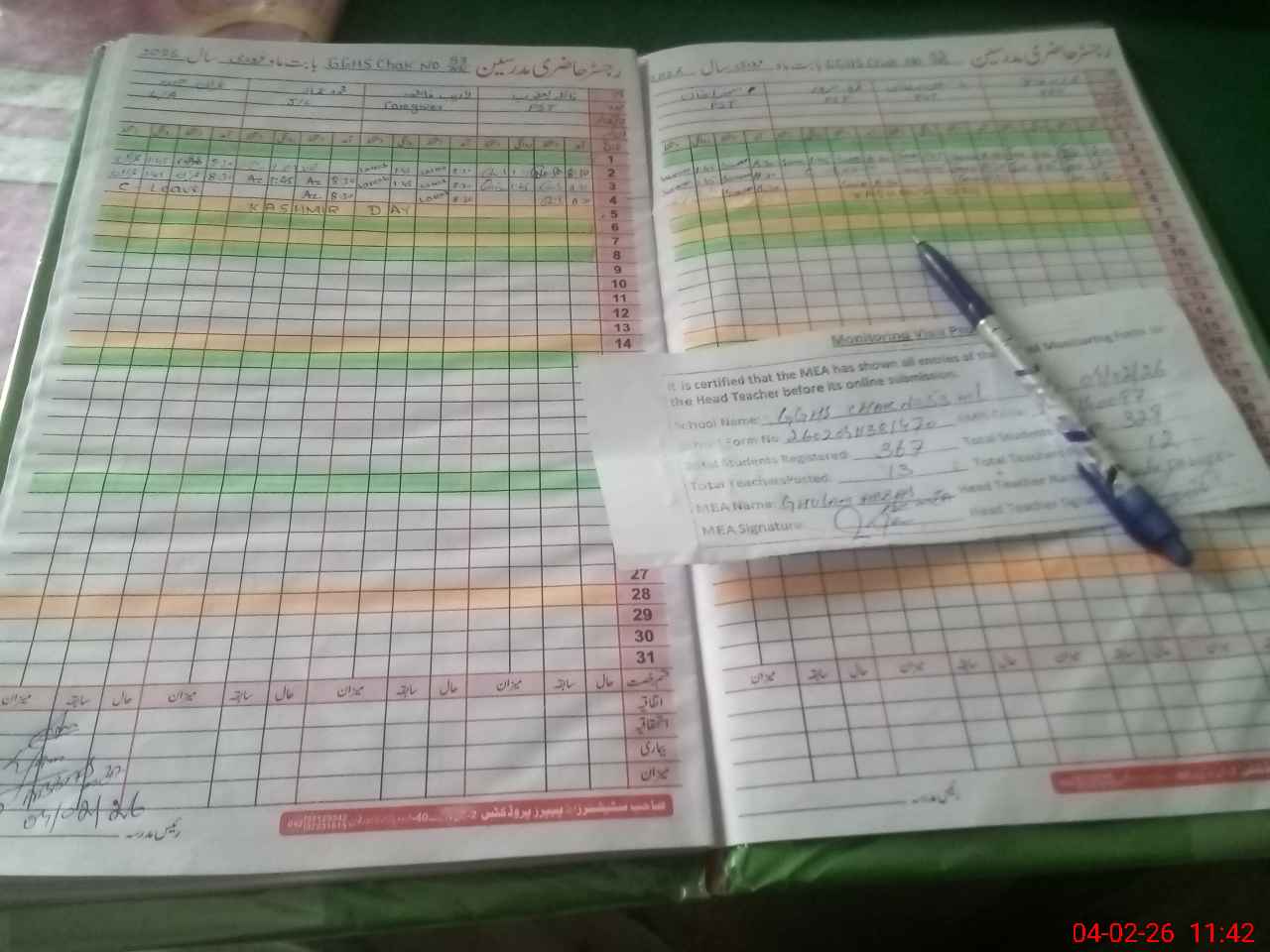 | Attendance Register | Head Teacher | MEA with School | Visit Proof |