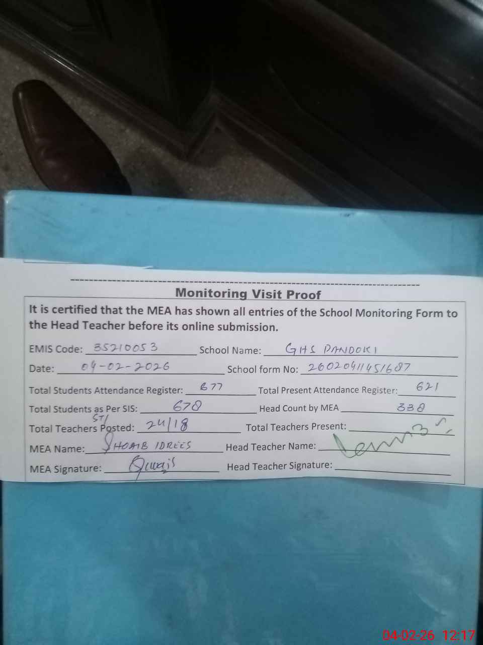 | Remarks (Use Separate Page if Required): 1. The school comprises of two campuses all classes studying in main campus while second campus having four spare rooms and ground almost area of 18 kenal. 2. A difference of 283 students founds between students attendance register and physical head counting of the school 3. The cleanliness of the school classrooms ground and toilets are very poor 4. Almost all water tab of hand washing points are broken 5. Five classrooms are declared dangerous locally 6. No administrator visit conducted in previous month | |||||