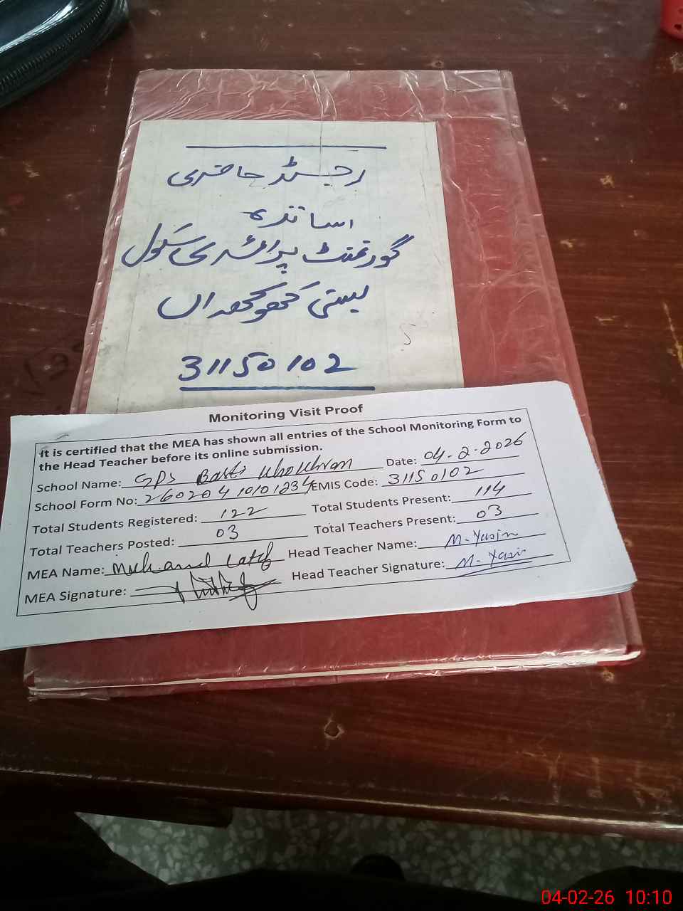 | Attendance Register | Head Teacher | MEA with School | Visit Proof |