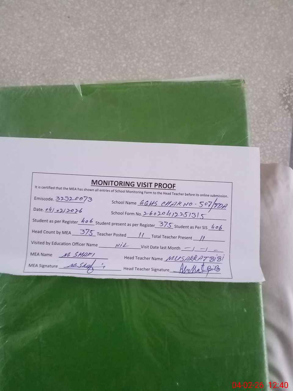 | EMIS Code: 32320073 | Name of School: GGHS CHAK NO. 507 TDA | |||