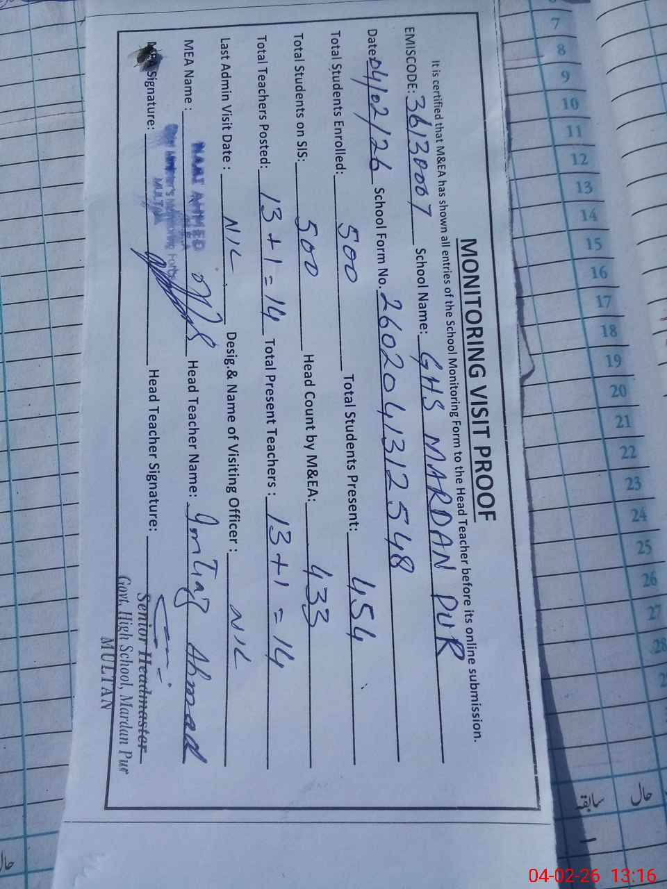 | EMIS Code: 36130007 | Name of School: GHS MARDAN PUR MULTAN | |||