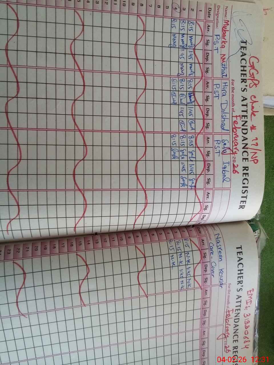 | Total no. of Classrooms: 3 No. of Classrooms Used for Teaching: 2 No. of Classrooms Storing Old Furniture, FTBs, etc: 0Comments if Any: Sir teachers and students attendance on sis not carried out NSB record Cash book not available |