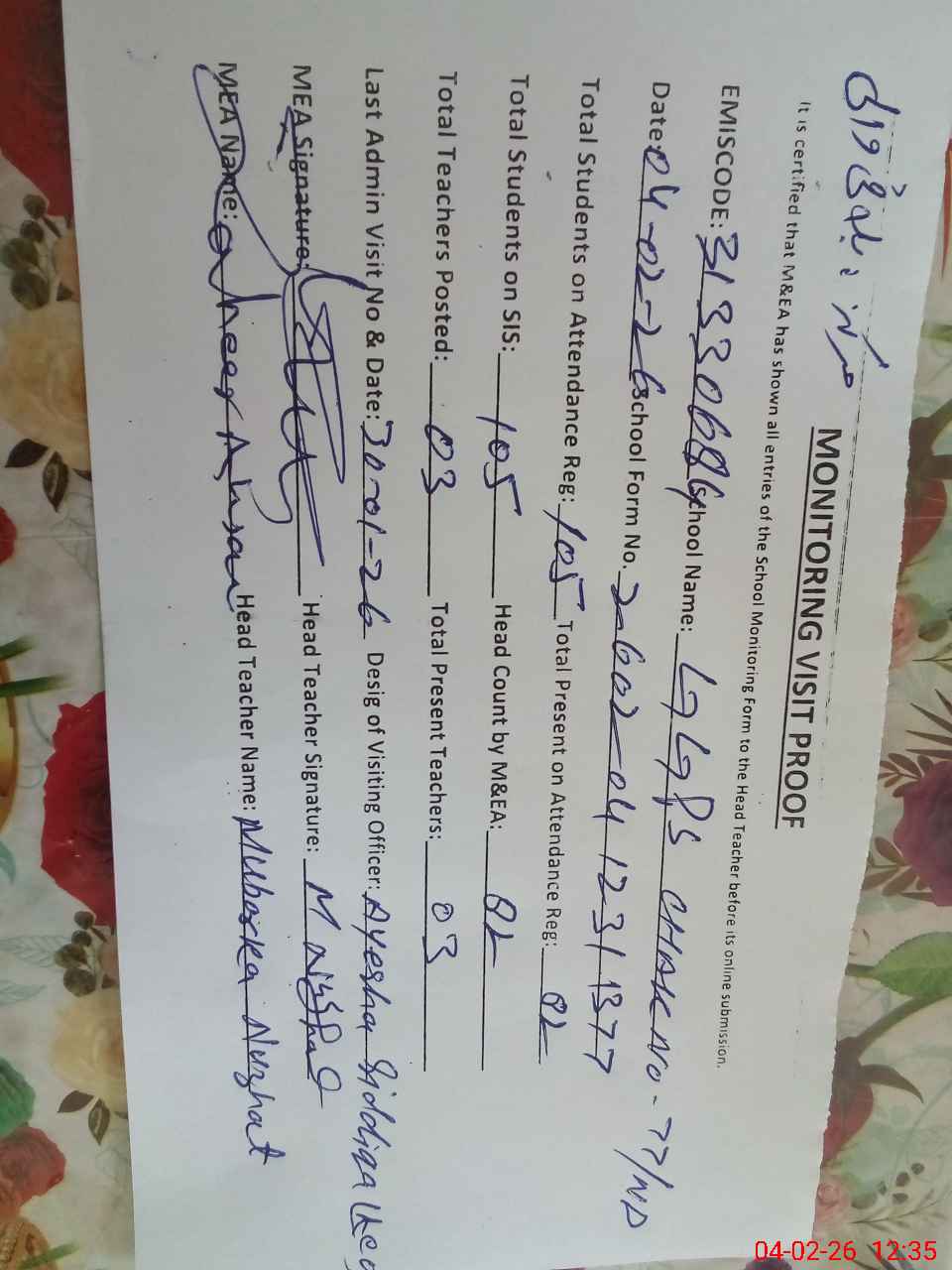 | Attendance Register | Head Teacher | MEA with School | Visit Proof |