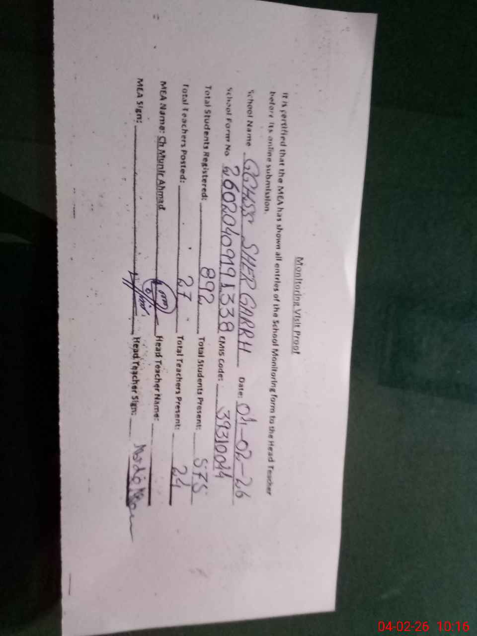 | EMIS Code: 39310044 | Name of School: GGHSS SHER GARRH | |||