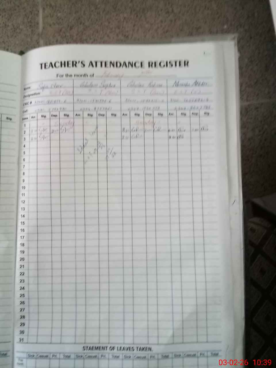 | CNIC | Full Name | Designation | R/C | Absence During Last Calender Month |