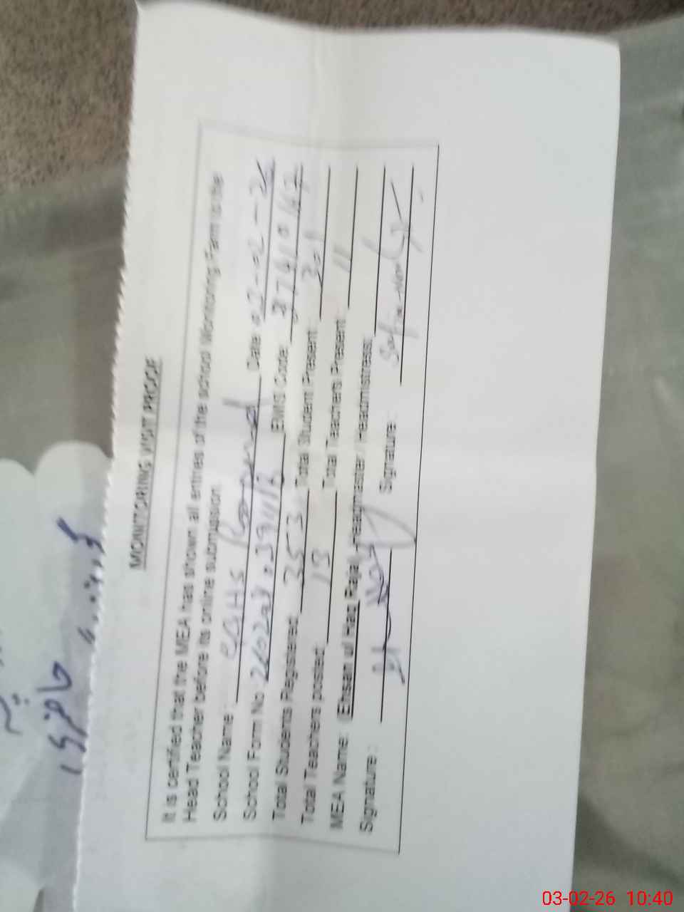 | Monitoring Date: 03-02-2026 | Start Time: 03-02-2026 09:30 AM | End Time: 03-02-2026 10:40 AM | Name of MEA: Eh**** UlHa**** Ra**** | |