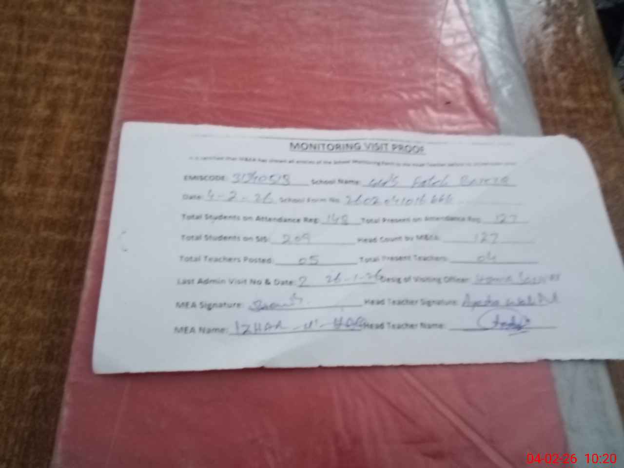 | Attendance Register | Head Teacher | MEA with School | Visit Proof |