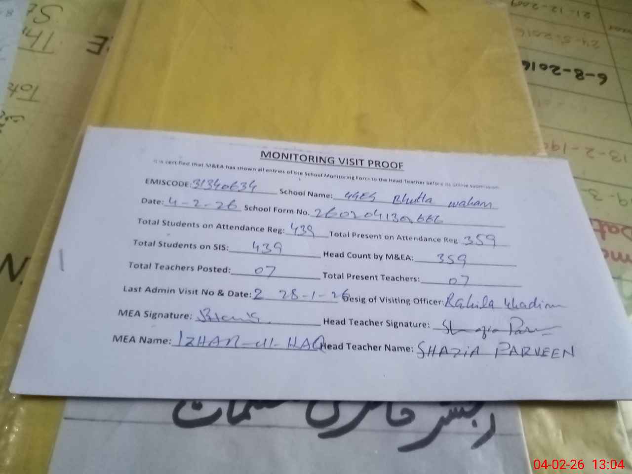 | EMIS Code: 31340634 | Name of School: GGES BHUTTA WAHAN | |||