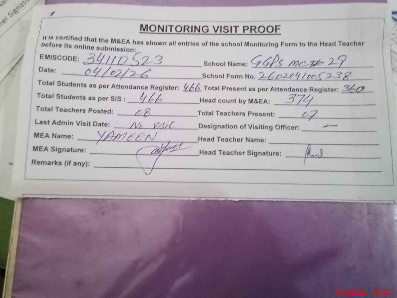 | Attendance Register | Head Teacher | MEA with School | Visit Proof |