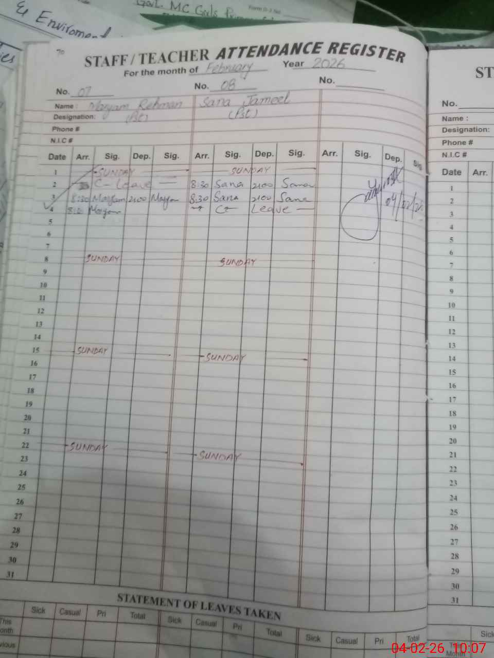 | CNIC | Full Name | Designation | R/C | Absence During Last Calender Month |