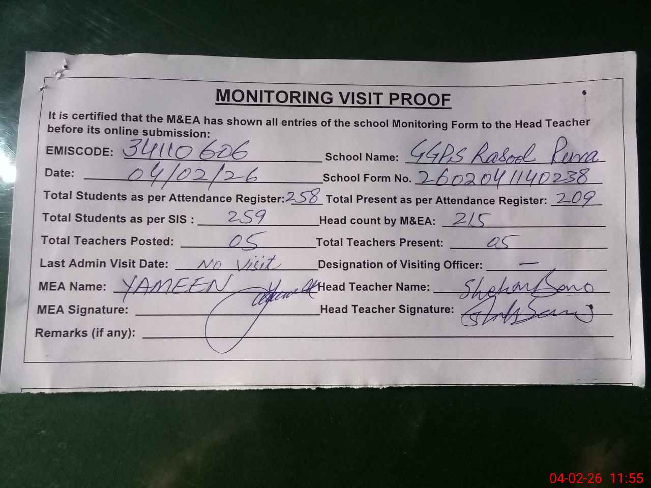 | EMIS Code: 34110606 | Name of School: GGPS RASOOL PURA | |||