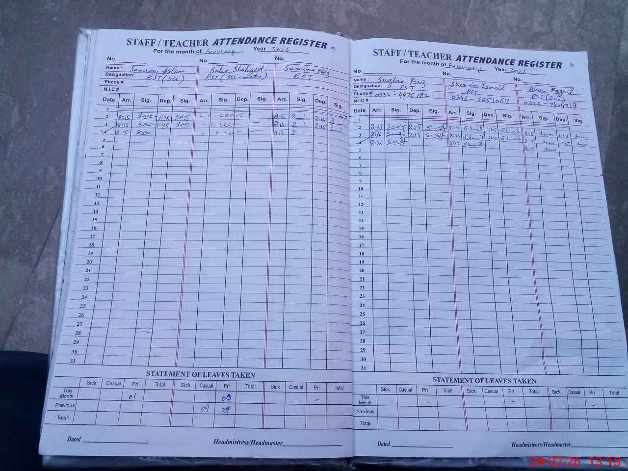 | CNIC | Full Name | Designation | R/C | Absence During Last Calender Month |