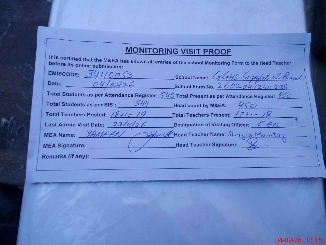| Attendance Register | Head Teacher | MEA with School | Visit Proof |