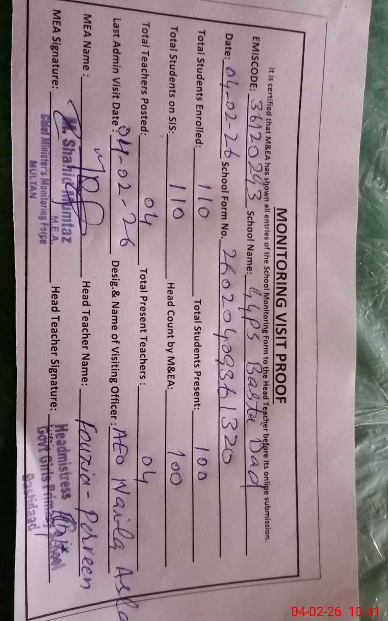| EMIS Code: 36120293 | Name of School: GGPS BASTI DAD SHUJABAD MULTAN | |||