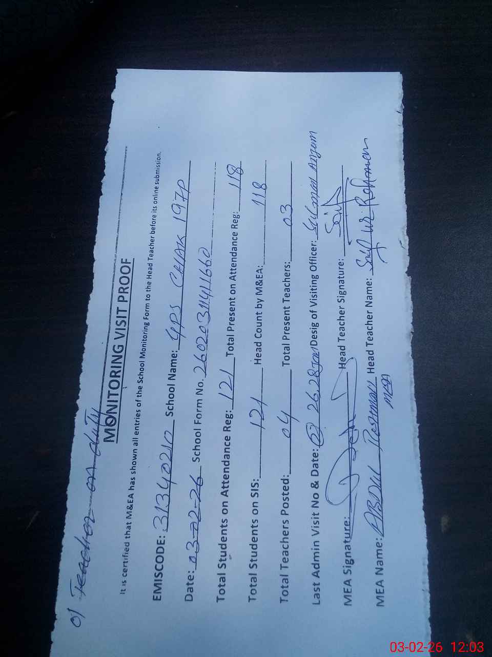 | Attendance Register | Head Teacher | MEA with School | Visit Proof |