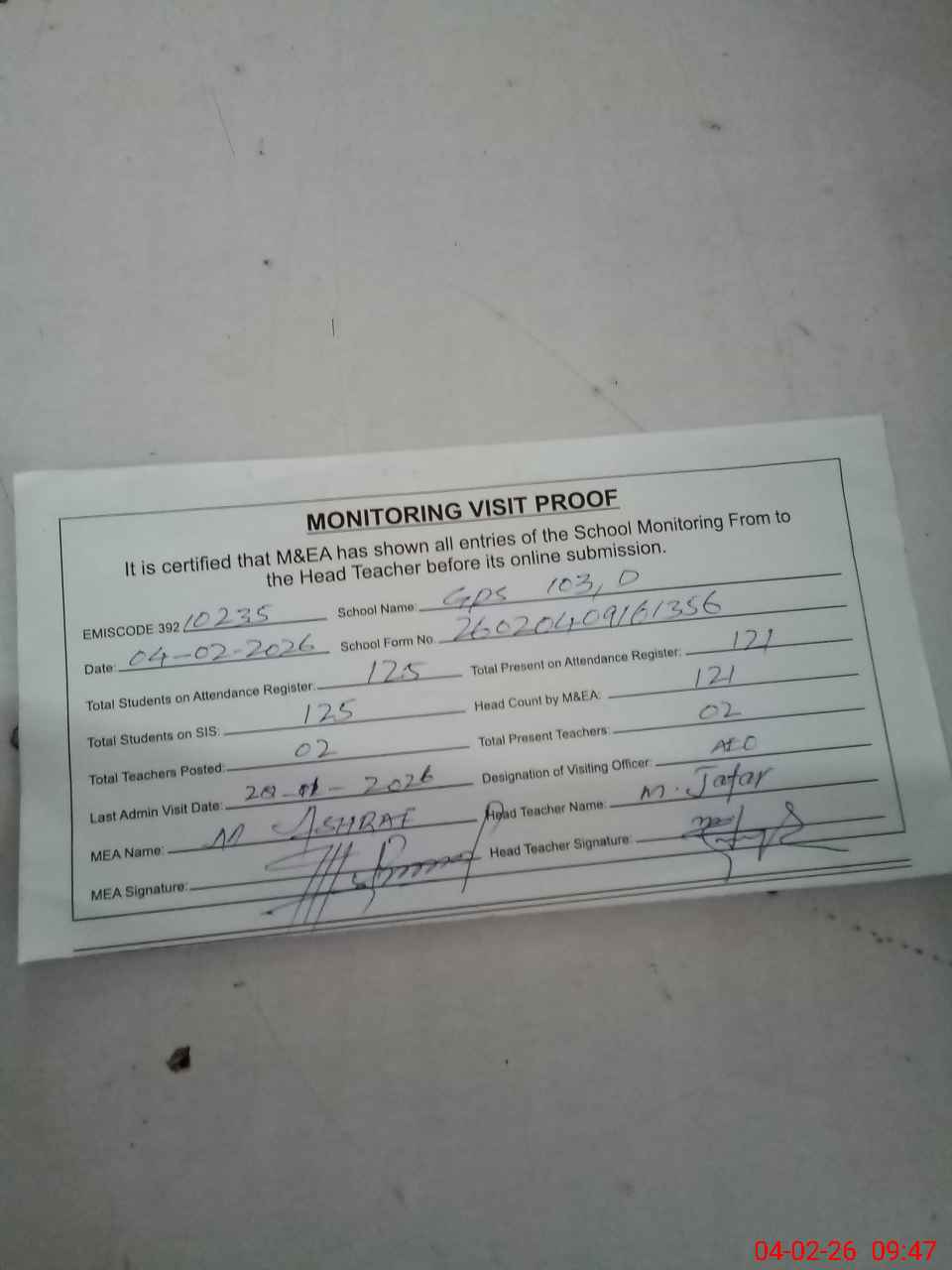 | EMIS Code: 39210235 | Name of School: GPS CHAK NO. 103 D | |||