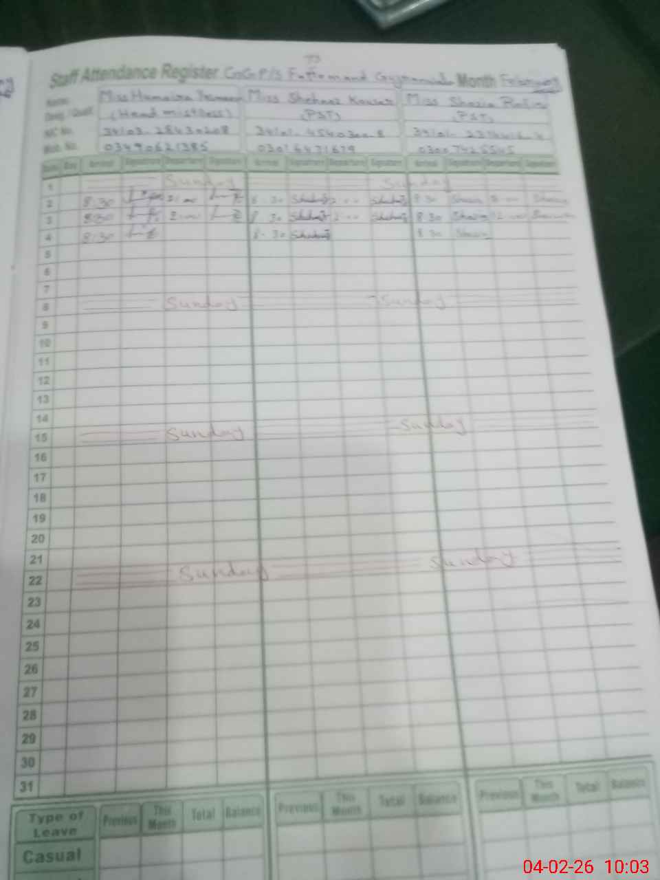 | CNIC | Full Name | Designation | R/C | Absence During Last Calender Month |