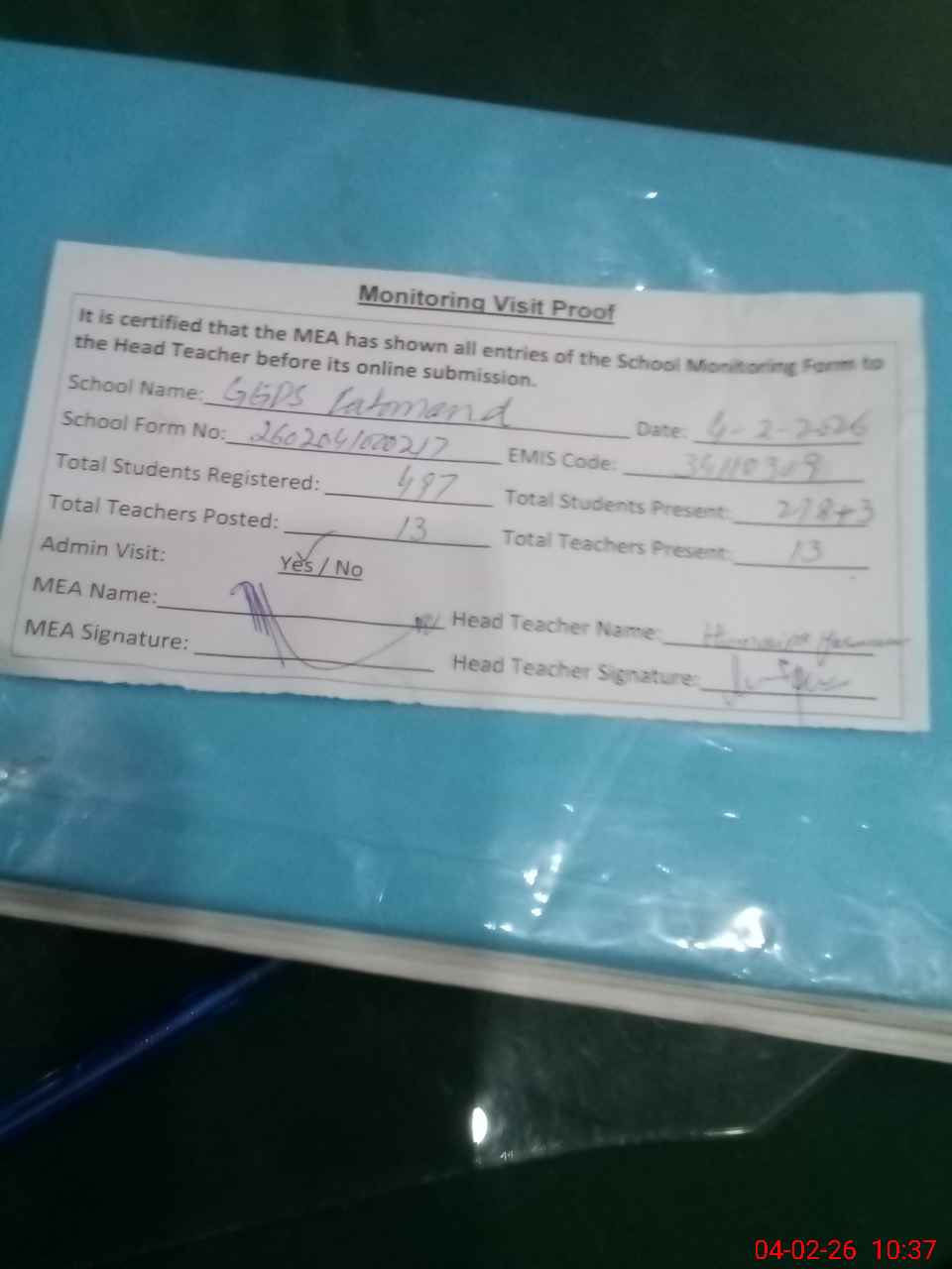 | Attendance Register | Head Teacher | MEA with School | Visit Proof |