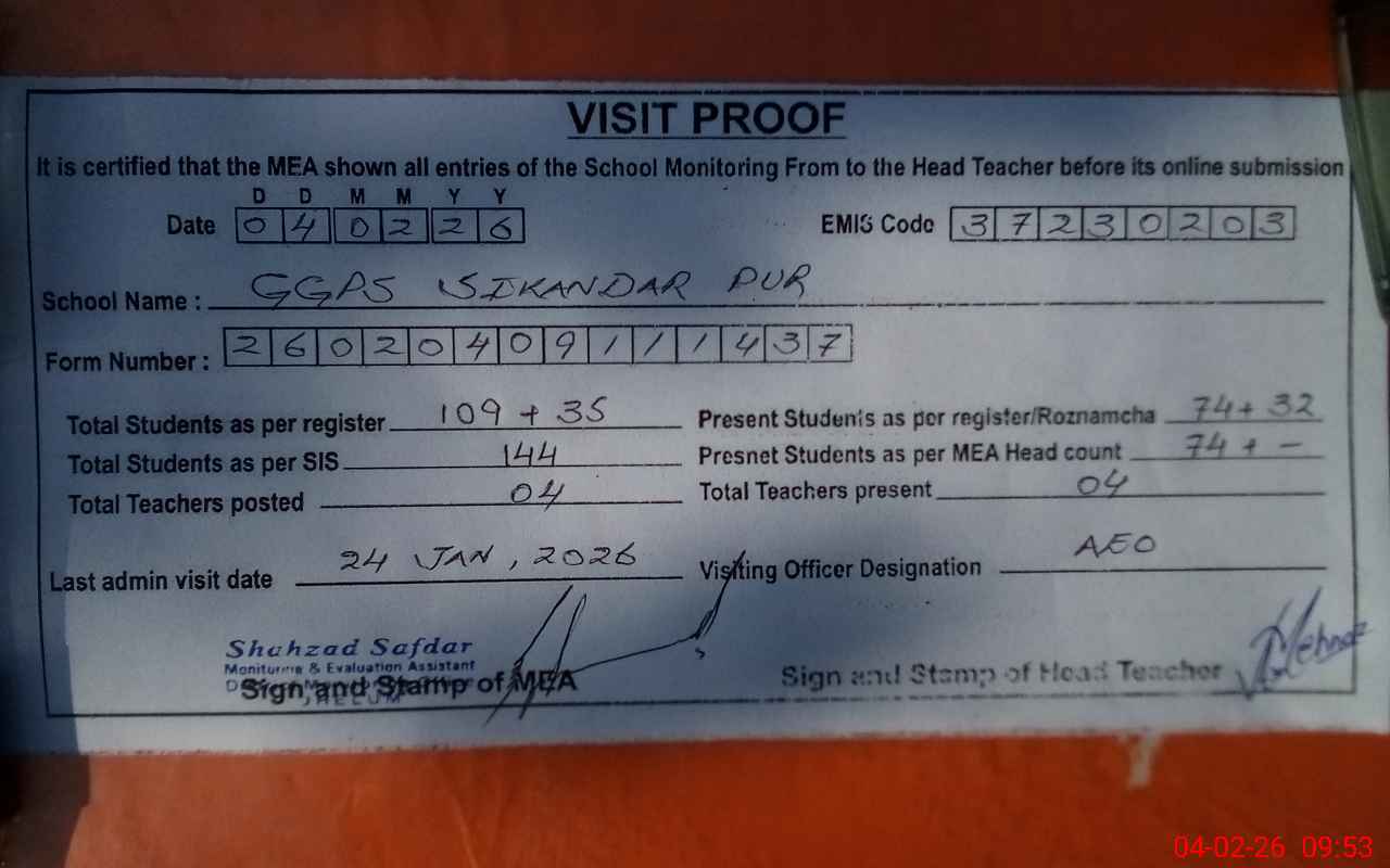 | EMIS Code: 37230203 | Name of School: GGPS SIKANDAR PUR | |||