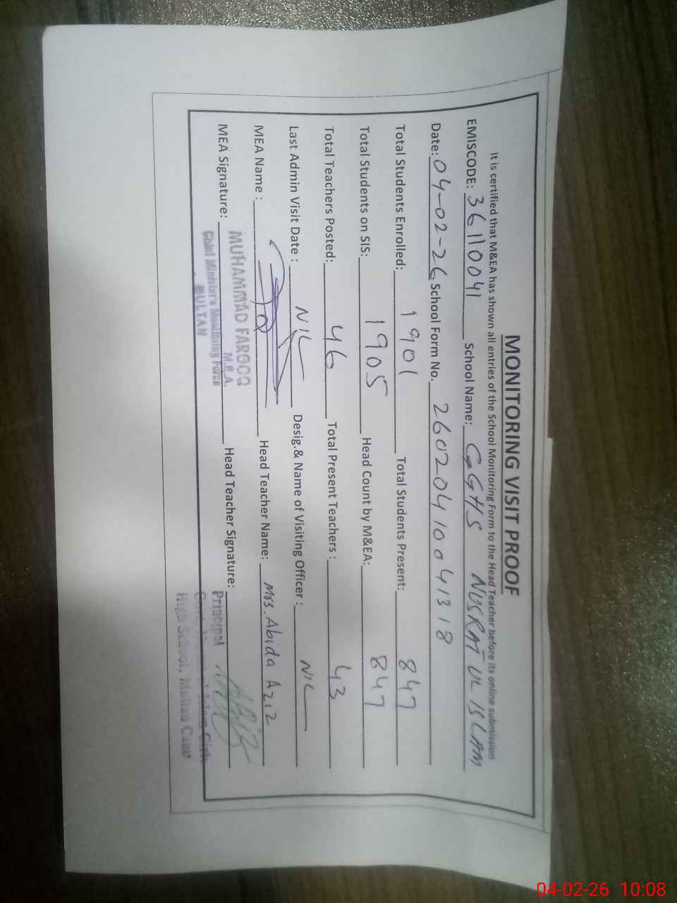 | Certified that this School was Inspected by the Undersigned MEA/DMO Today and the Information Stated Above is as Per Record. | |||||