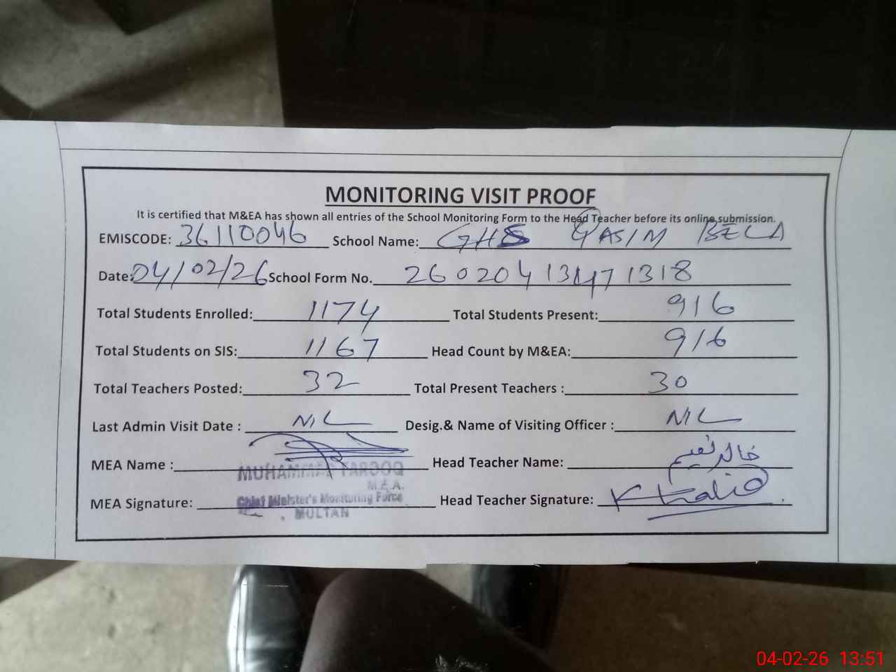 | Attendance Register | Head Teacher | MEA with School | Visit Proof |