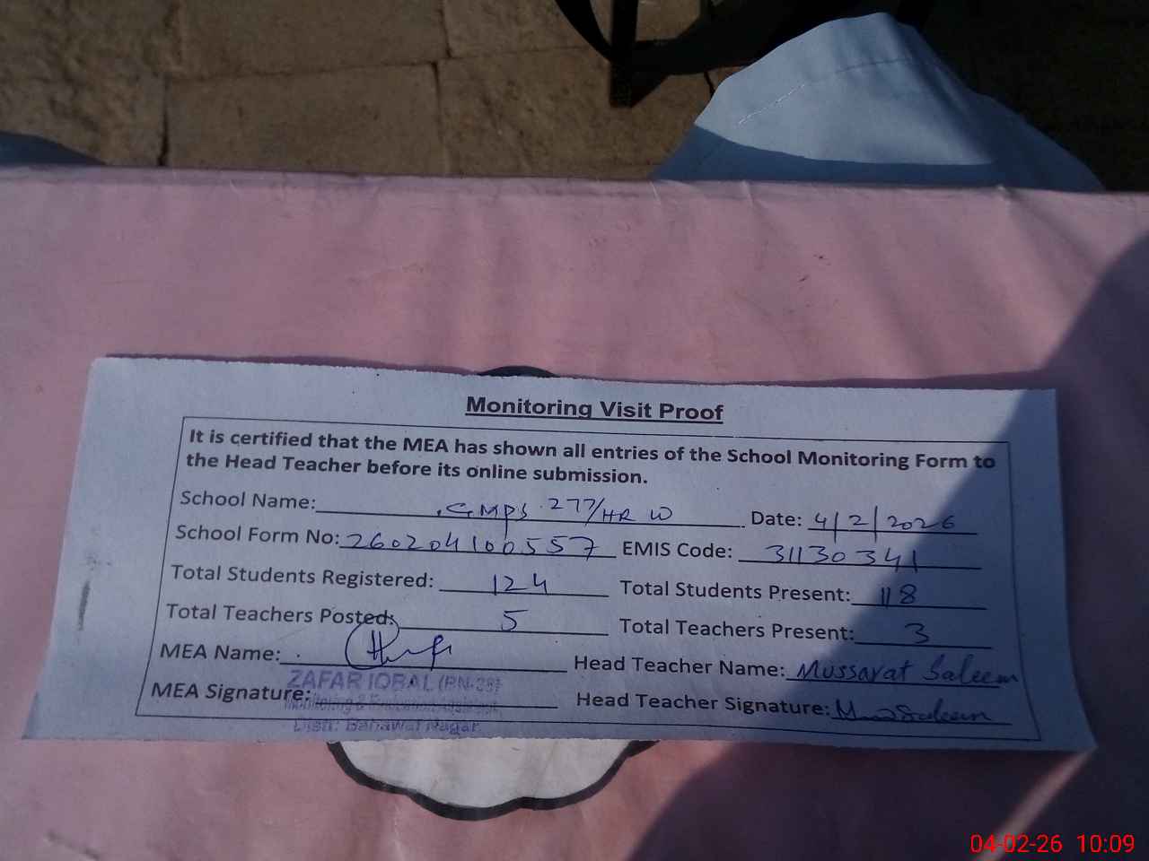 | EMIS Code: 31130341 | Name of School: GMPS CHAK NO 277 HR W | |||
