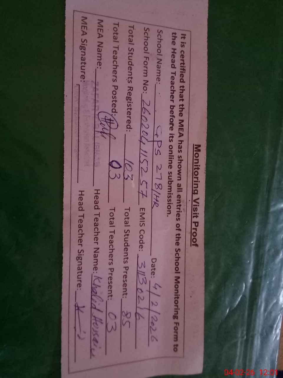 | Attendance Register | Head Teacher | MEA with School | Visit Proof |