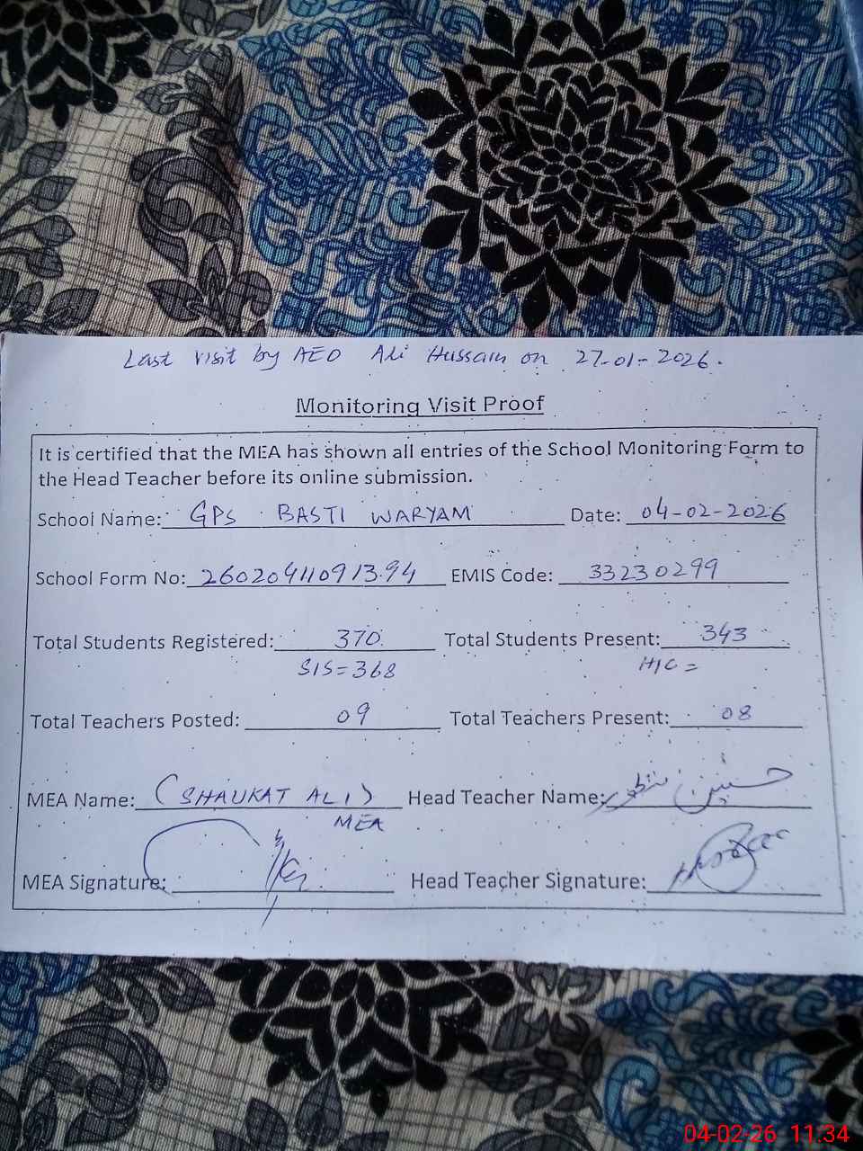 | Attendance Register | Head Teacher | MEA with School | Visit Proof |