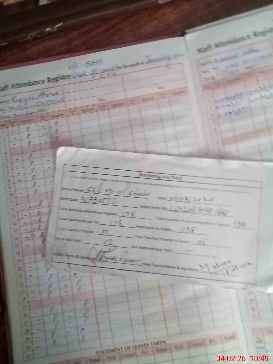 | Attendance Register | Head Teacher | MEA with School | Visit Proof |