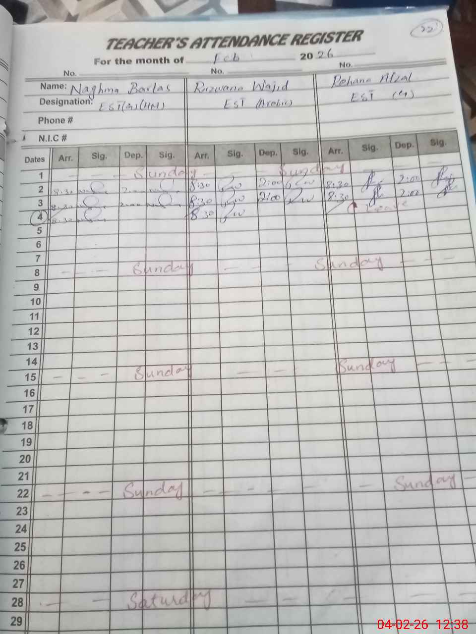 | CNIC | Full Name | Designation | R/C | Absence During Last Calender Month |