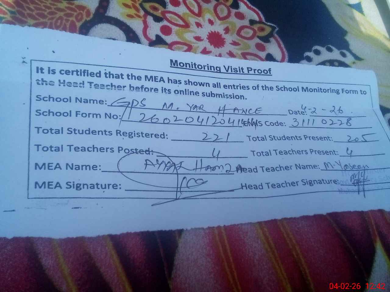| Attendance Register | Head Teacher | MEA with School | Visit Proof |