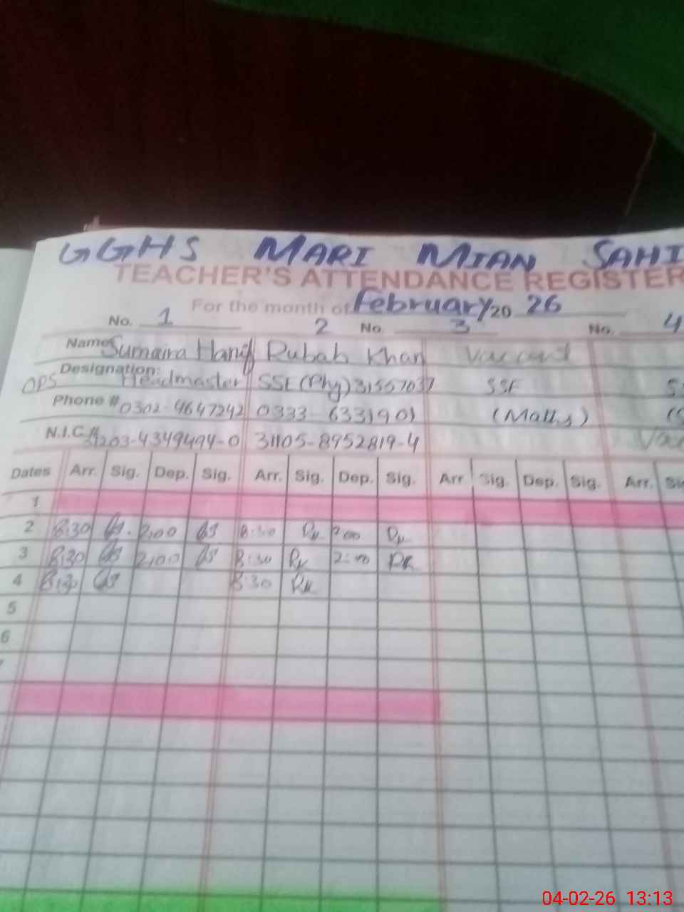 | Name: Su**** Ha**** Designation: (School Headmaster's/Headmistress's) Sst Science Phone/Cell Number: 03**** |