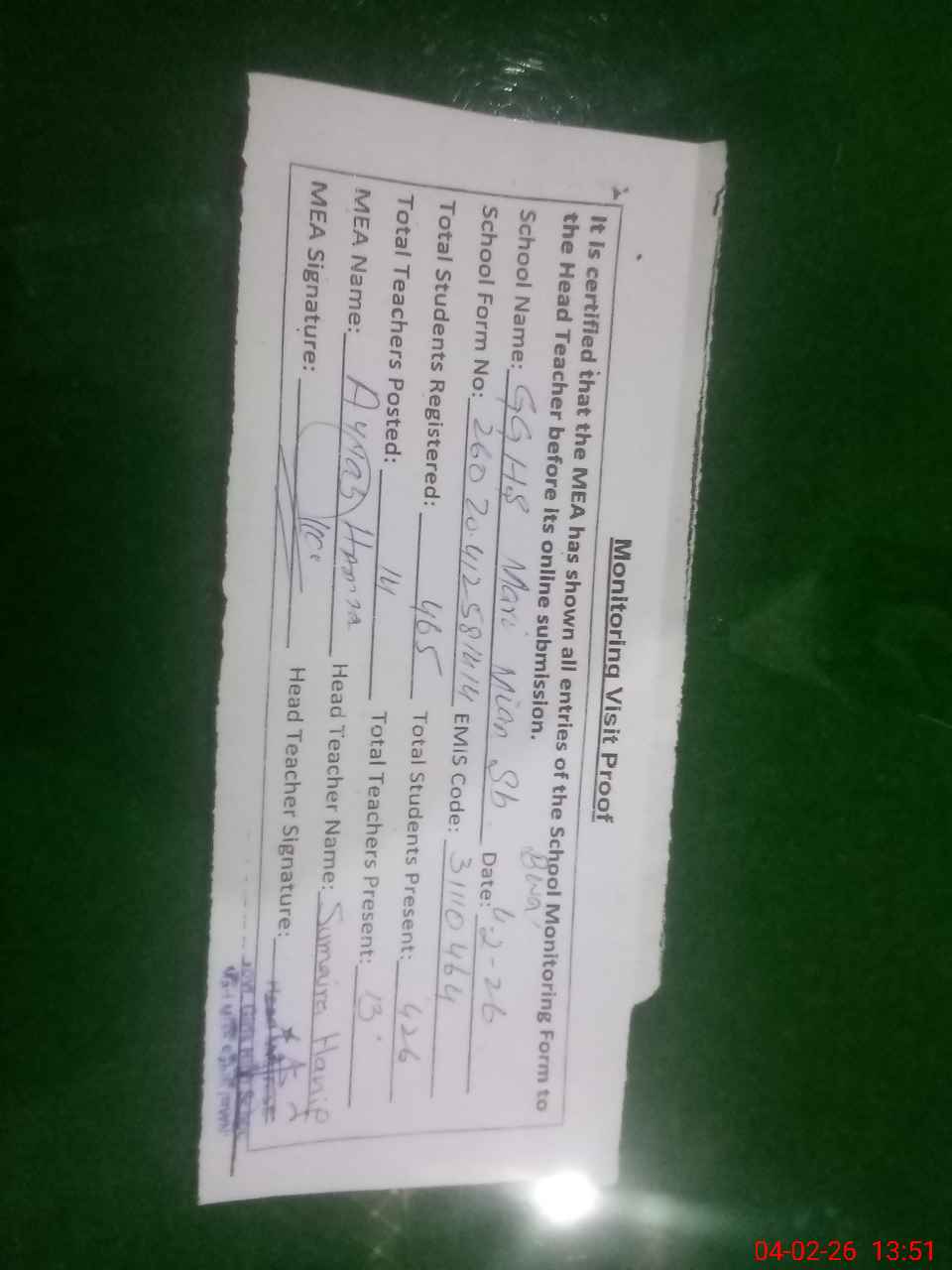 | Attendance Register | Head Teacher | MEA with School | Visit Proof |