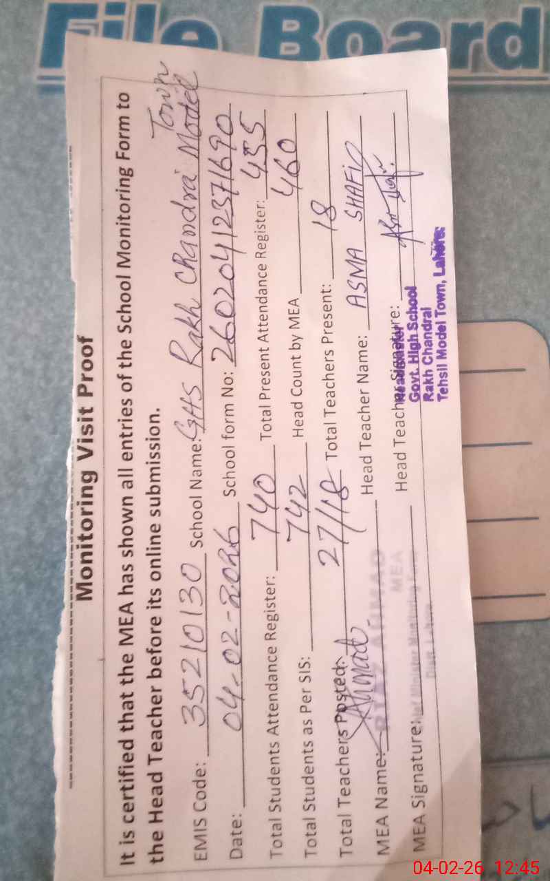 | EMIS Code: 35210130 | Name of School: GHS RAKH CHANDRAI TEHSIL MODEL TOWN (Newly upgraded) | |||