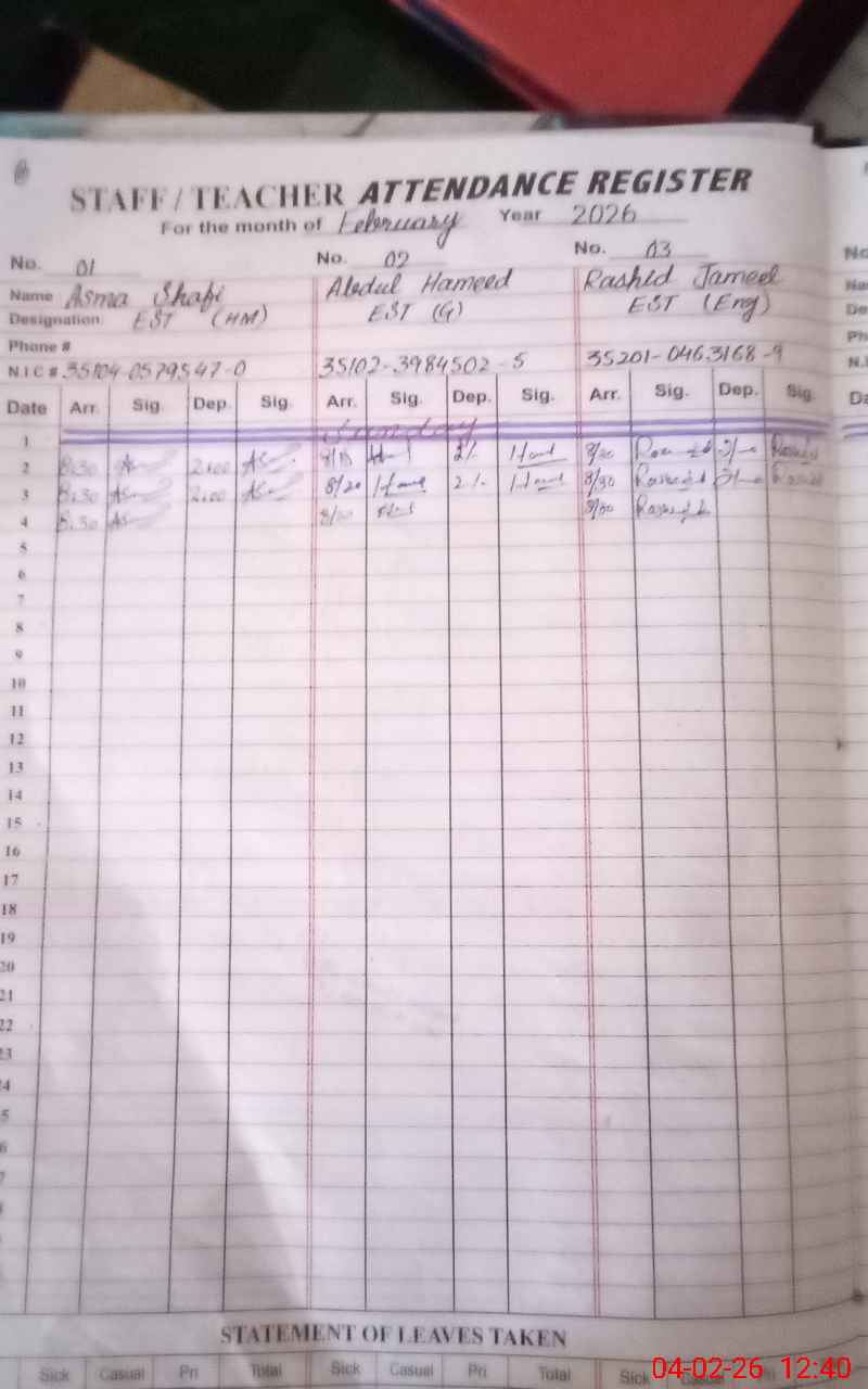 | Remarks (Use Separate Page if Required): Teacher Yaseen pst is suspended w e f 02 February 2026 FTF register not maintained and updated DEO & DDEO visited this school on 29 January 2026 | |||||