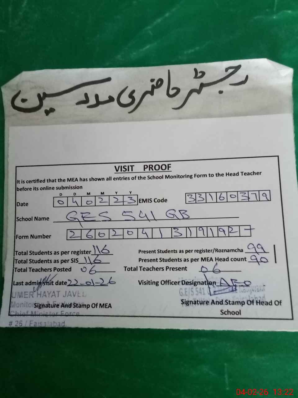 | EMIS Code: 33160379 | Name of School: GES CHAK NO.541/GB | |||
