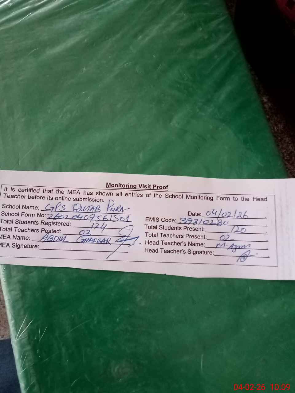 | EMIS Code: 39310280 | Name of School: GPS QUTAB PURA | |||