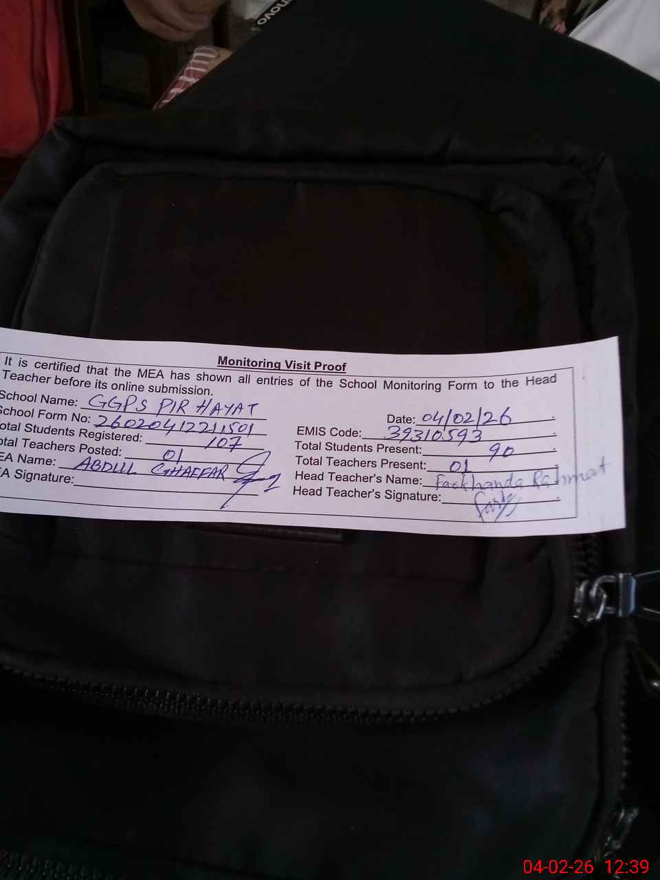 | Attendance Register | Head Teacher | MEA with School | Visit Proof |