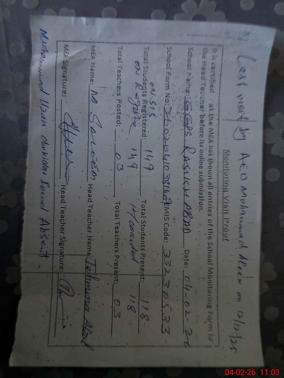 | Attendance Register | Head Teacher | MEA with School | Visit Proof |