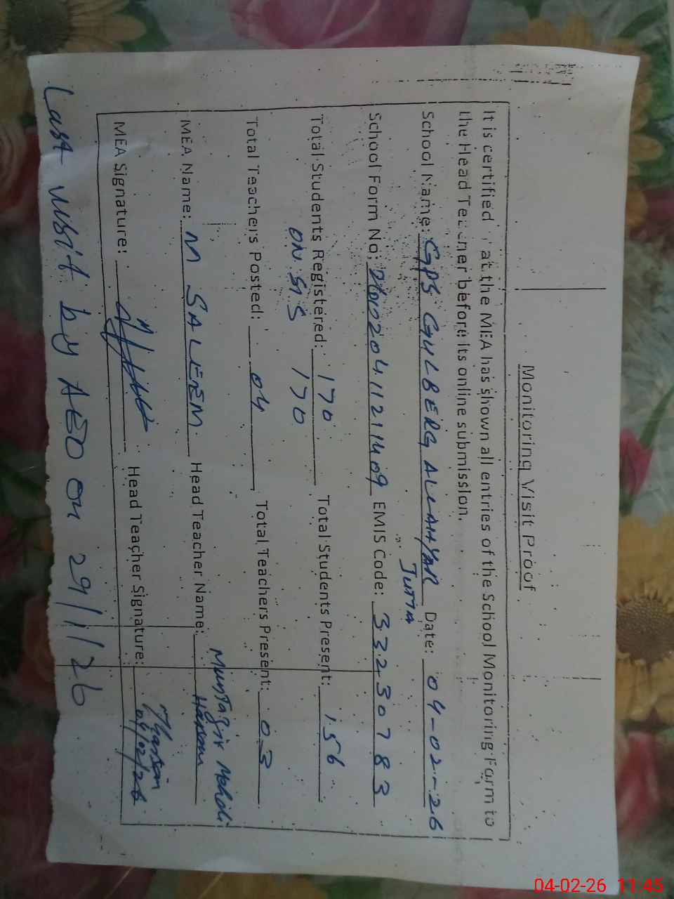 | Attendance Register | Head Teacher | MEA with School | Visit Proof |