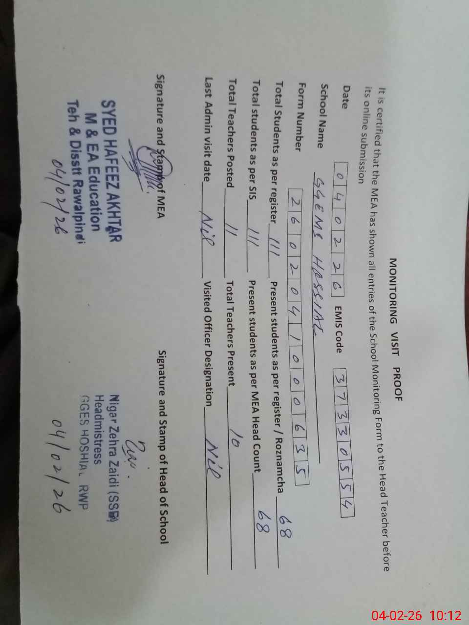 | Certified that this School was Inspected by the Undersigned MEA/DMO Today and the Information Stated Above is as Per Record. | |||||