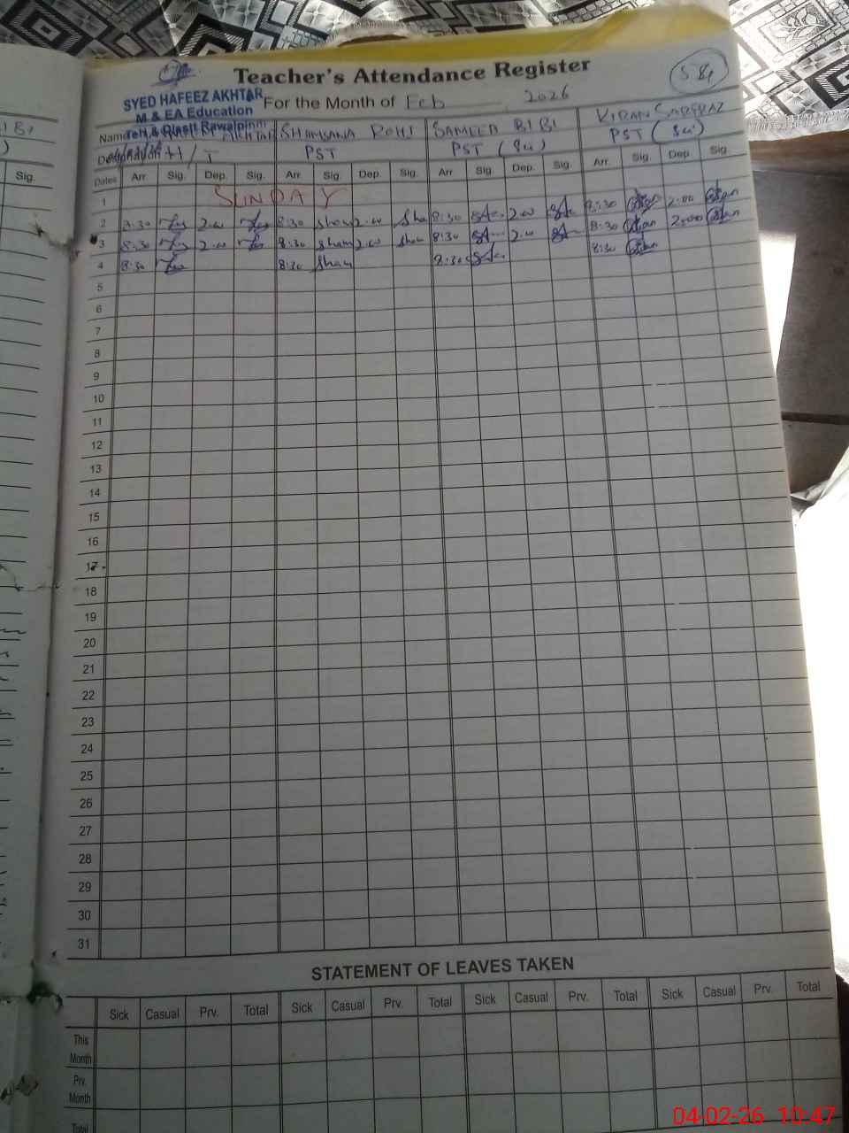 | Leave | Duty | Absent | Maternity | Medical | Ex- Pak |