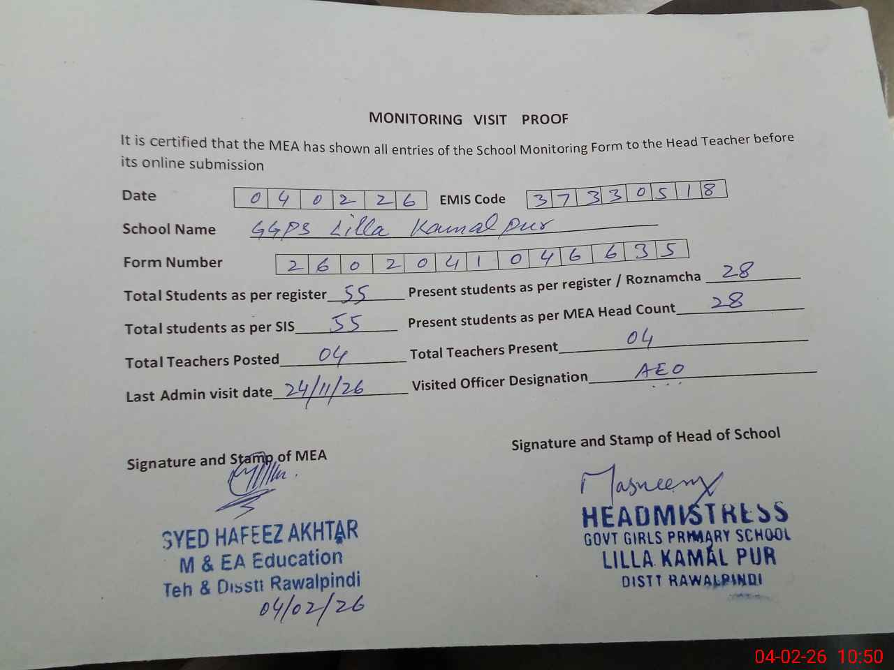 | Attendance Register | Head Teacher | MEA with School | Visit Proof |