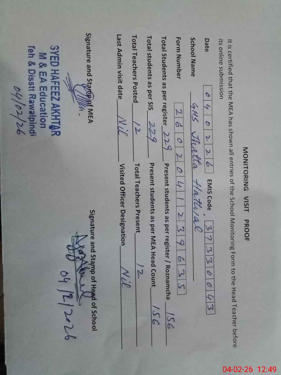 | Certified that this School was Inspected by the Undersigned MEA/DMO Today and the Information Stated Above is as Per Record. | |||||
