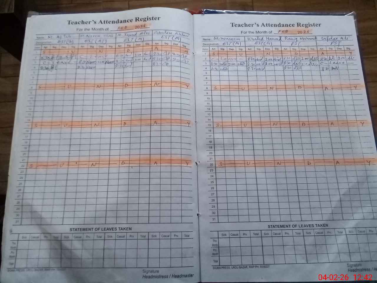 | CNIC | Full Name | Designation | R/C | Absence During Last Calender Month |