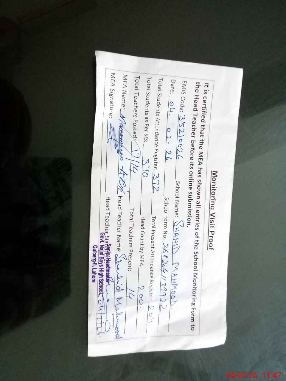 | Attendance Register | Head Teacher | MEA with School | Visit Proof |